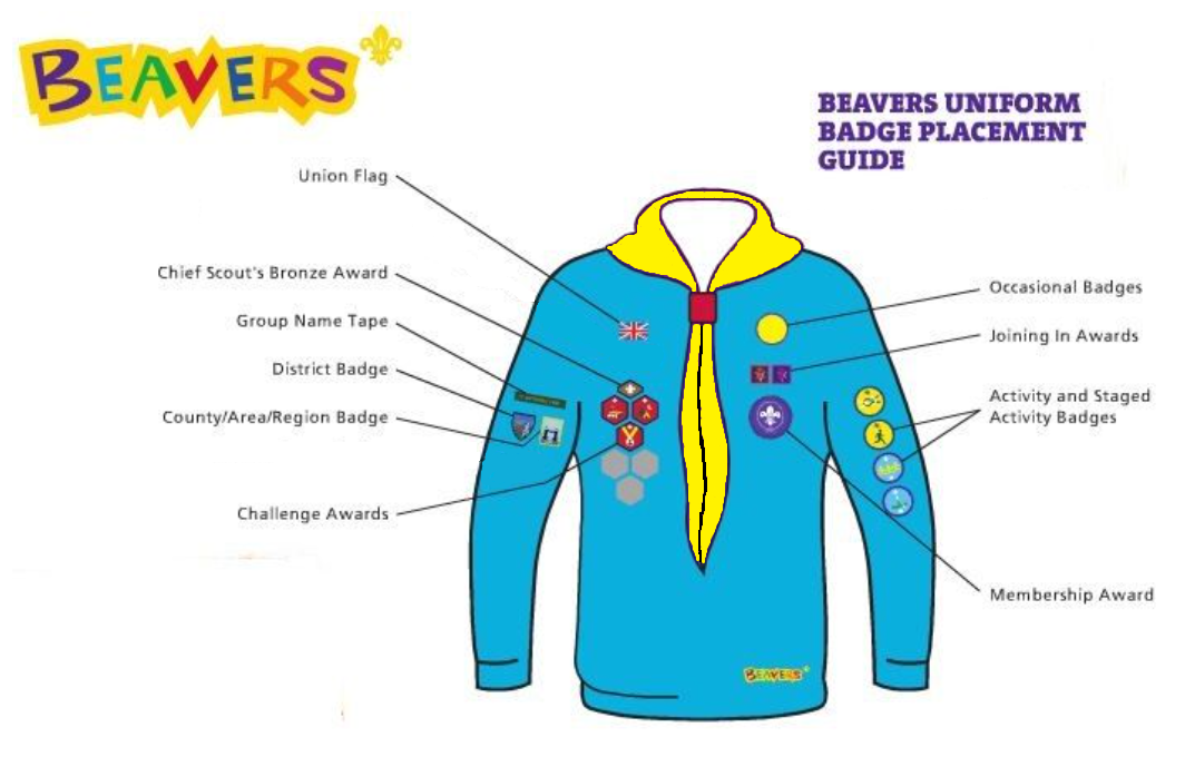 Beavers will be awarded badges throughout their time as a Beaver and we kindly ask that these are sewn on to their sweatshirts. Below is a diagram to help you with the location of where the badges need to be sewn and we do have a badge sewing service at 1st Winnersh in exchange for a small donation to the group.